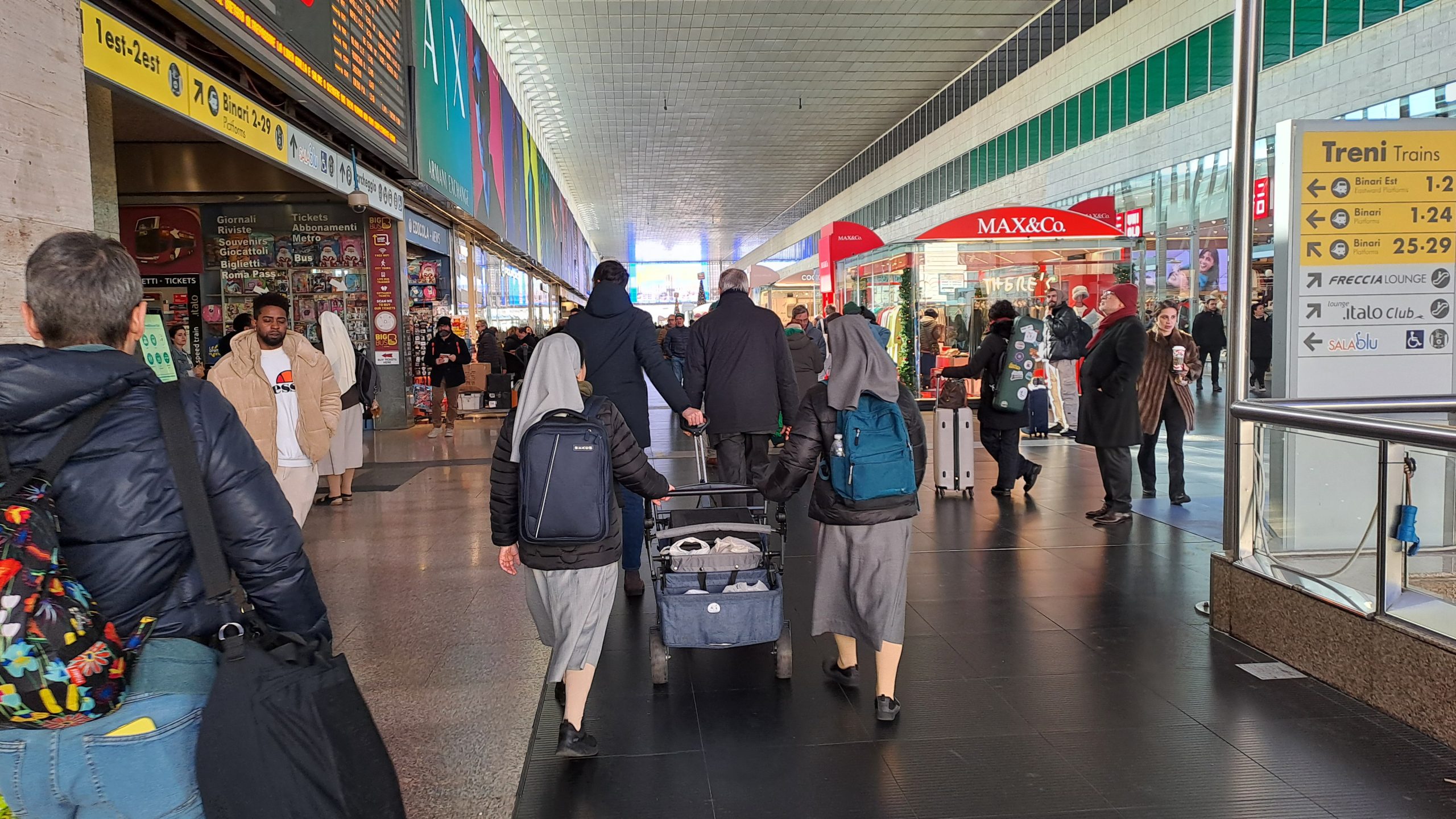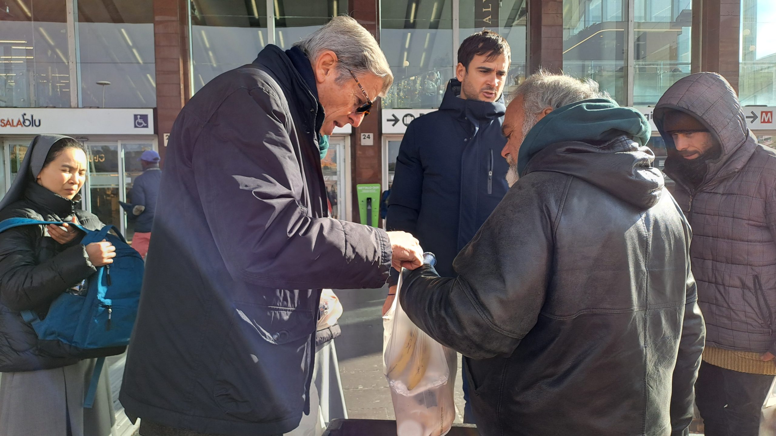 Verso il fine settimana la stazione diventa ancora più affollata. Eppure, proprio ogni sabato a mezzogiorno, qualcosa cambia. Un gruppo di laici e di suore si incontra fuori dalla stazione: condividono un pranzo semplice già preparato e si dividono in due piccoli gruppi. Uno si dirige verso l’esterno della stazione, l’altro entra nell’atrio centrale.