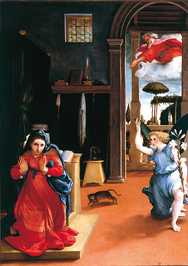 La vera novità dell’opera non è il gatto. E non è nemmeno la postura di Maria, dipinta frontalmente mentre viene colta di sorpresa da Gabriele, un po’ arretrato: Lotto si ispira infatti all’Annunciazione Malchiostro di Tiziano, del 1519-20 (e, prima ancora, a quelle del pittore fiammingo Dieric Bouts, della seconda metà del Quattrocento). Il valore aggiunto dell’Annunciazione di Recanati è nell’apparizione in scena di un’ombra non casuale, quella dell’angelo, per compiere un’azione significativa. Un’ombra assente nei quadri di Tiziano e di Bouts.