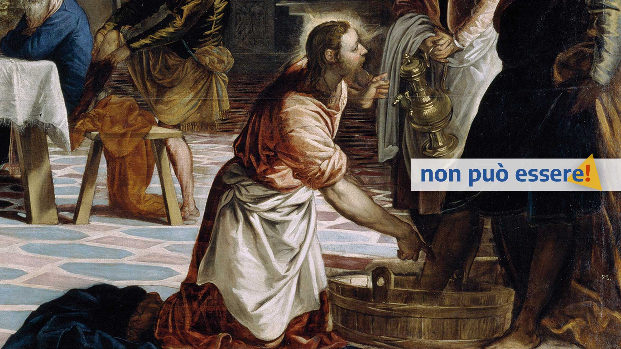 È un gesto che non solo si fa senza divisa, ma che porta tutti a togliersi la divisa. Mettersi ai piedi dell’altro, infatti, spinge anche l’altro a venirti incontro, slacciandosi i calzari, per predisporsi a ricevere. È un disarmo multilaterale: per di più contagioso, se porta persino ad aiutare il vicino a togliersi gli stivali, come si vede in quest’opera del Tintoretto (che amava l’episodio, al punto da dipingerlo sei volte!). La novità è proprio nel fatto che gli apostoli si stiano aiutando tra loro: non sono ancora capaci di lavarsi i piedi gli uni agli altri, ma alcuni stanno cominciando a capire…