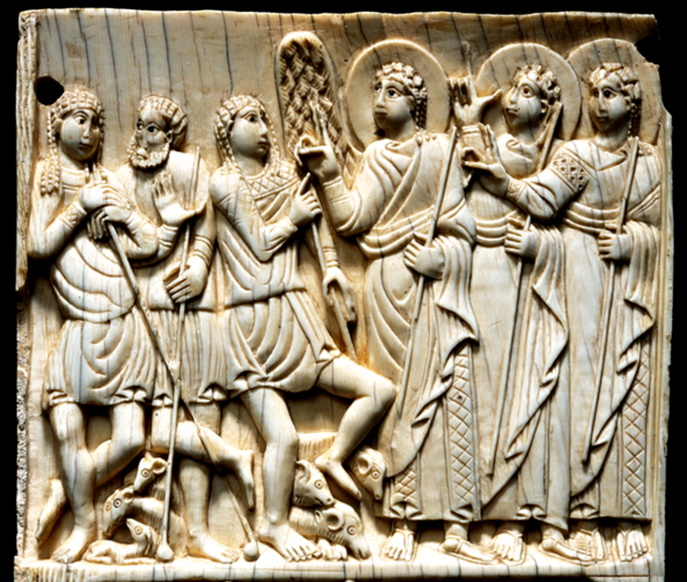 L’avorio di Salerno è in controtendenza: gli angeli sono ad altezza d’uomo e di donna. Ce n’è uno per ogni pastore, a dire come l’annuncio vada personalizzato, chiamando l’altro per nome e cercando le parole più adatte per lui. Gli angeli sanno che, di Dio, è meglio parlare a tu per tu: non rivolti all’umanità globale, ma all’umanità dei singoli, diversa da persona a persona.